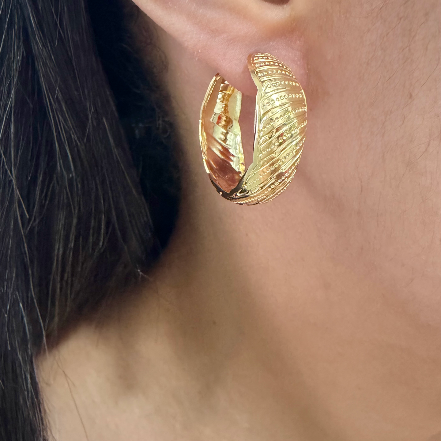 Inspirada nas argolas tradicionais, mas com textura em relevo e acabamento polido e diferenciado que reflete a luz de forma sutil, valorizando a região do rosto, agrega valor visual e tira da obviedade. Versátil e atemporal, é ideal para compor desde produções básicas até looks mais elegantes , sendo uma escolha segura para diferentes ocasiões. Um acessório indispensável para quem busca elegância sem esforço no dia a dia.