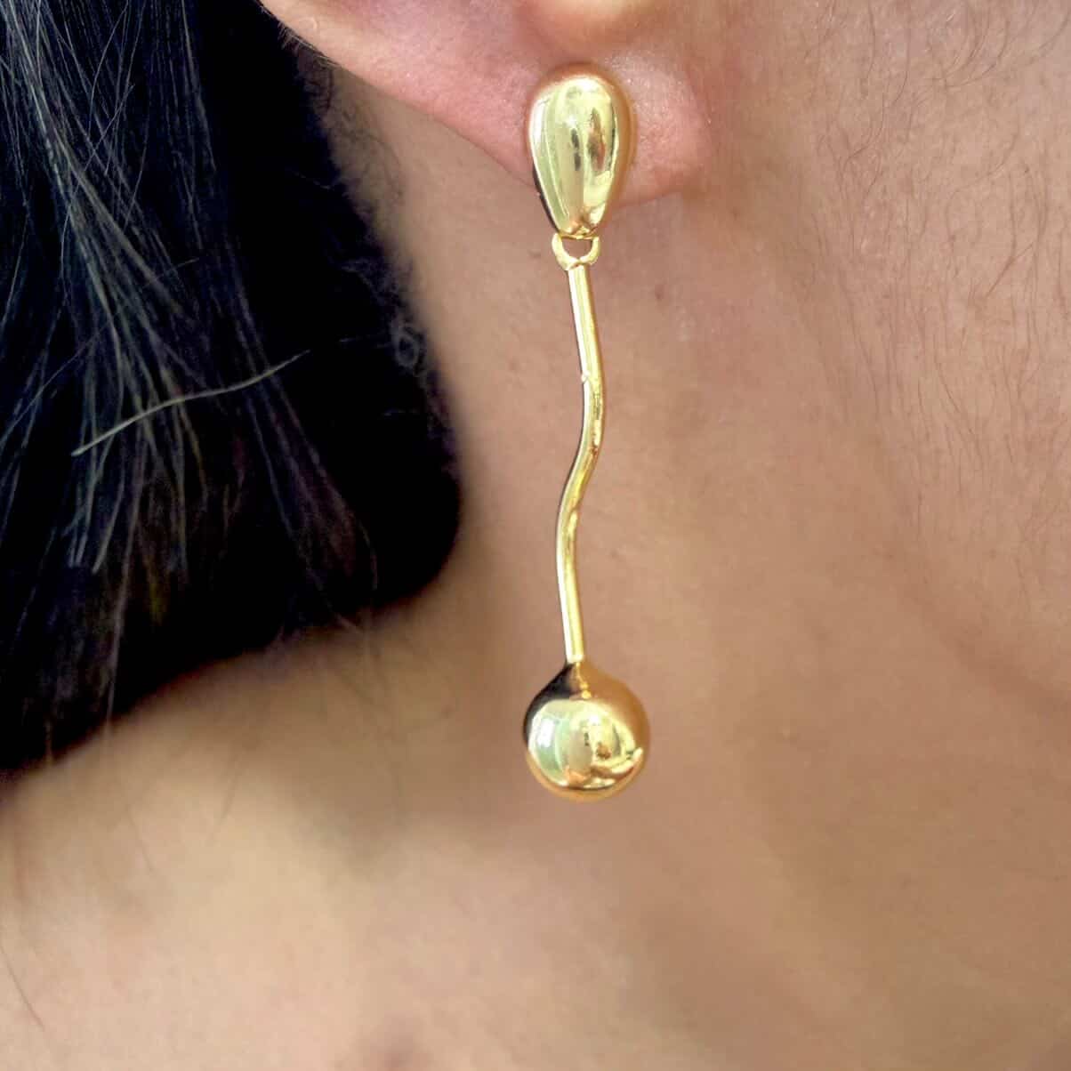 Dados técnicos: Brinco base gota e palito com bola 8mm, medindo 5cm de comprimento BANHO DE OURO 18k.